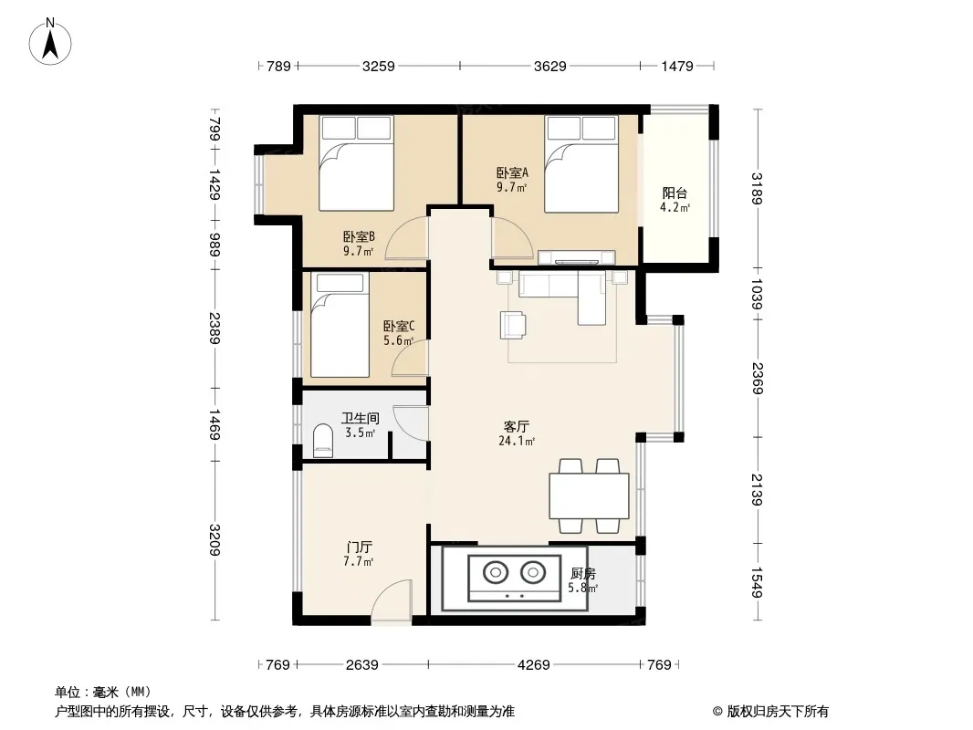 户型齐全,主打明厨,客厅朝南三居