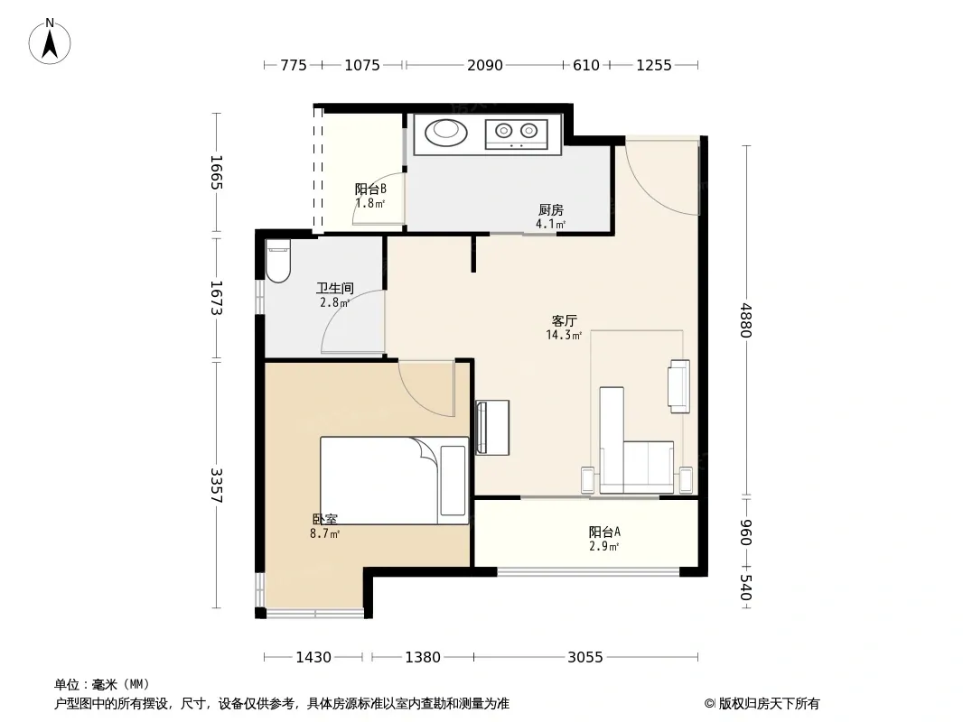 户型齐全,主打明厨,客厅朝南二居