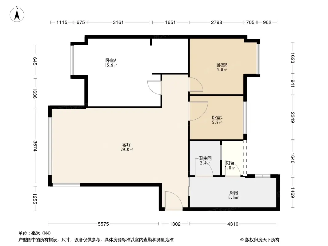 户型齐全,主打明卫,独立衣帽间,客厅朝南三居