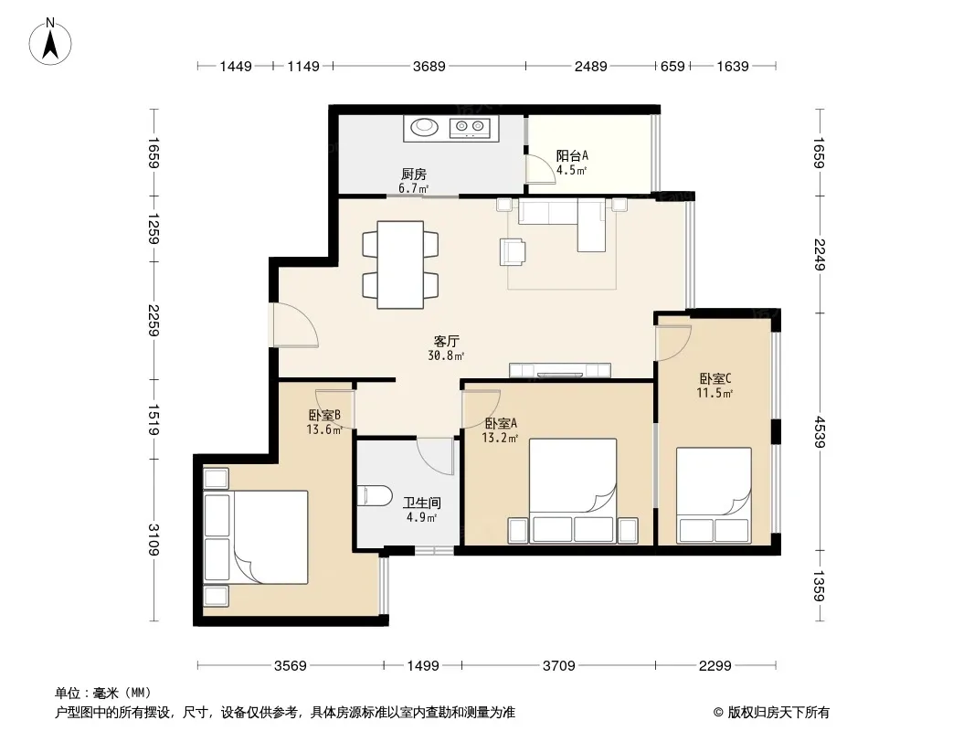 户型齐全,主打明厨,明卫,客厅朝南,全明格局三居