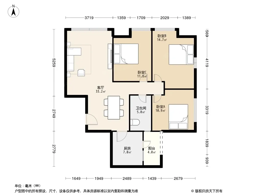户型齐全,主打明厨,明卫,客厅朝南,全明格局三居