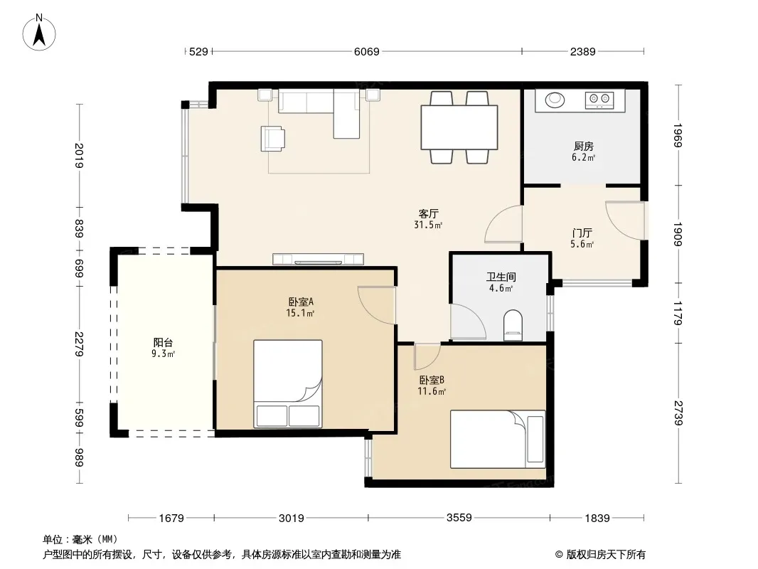 户型齐全,主打客厅朝南二居