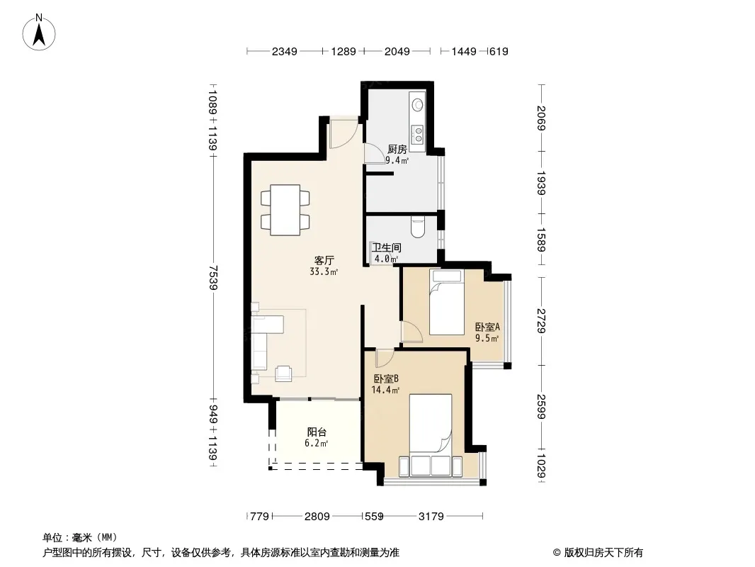 户型齐全,主打户型方正,明卫,客厅朝南,双阳台二居