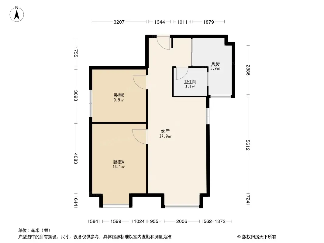 户型齐全,主打明厨,客厅朝南,主卧朝南二居