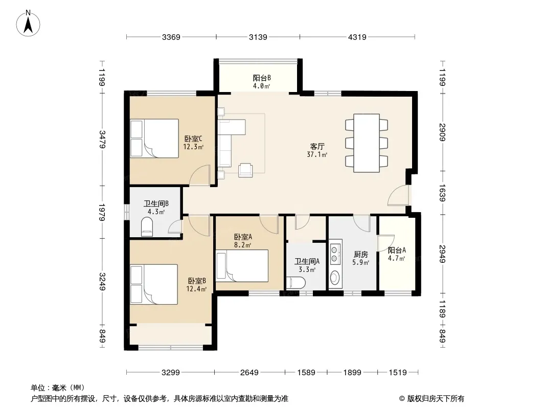 户型齐全,主打户型方正,明卫,明厨,客厅朝南,双阳台三居