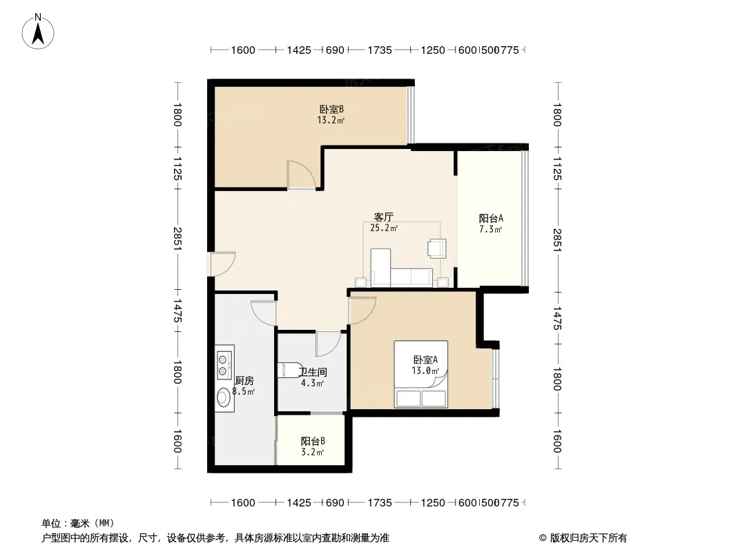 户型齐全,主打明厨,客厅朝南,双卧朝南,主卧朝南二居