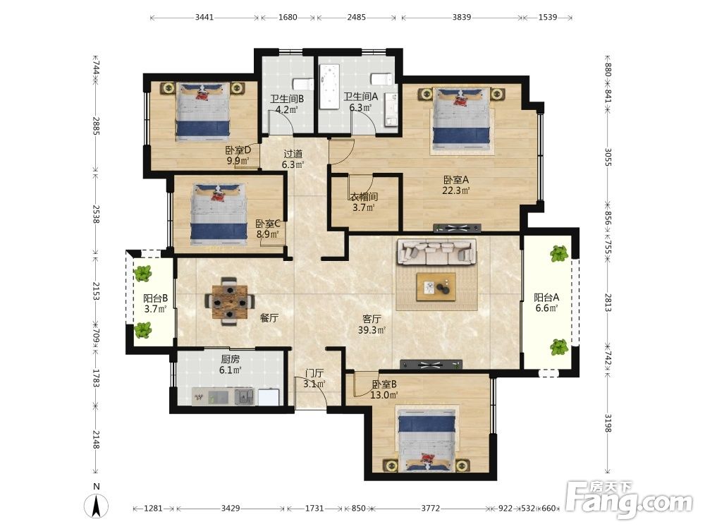 户型齐全,主打明卫,明厨,独立衣帽间,双阳台三居