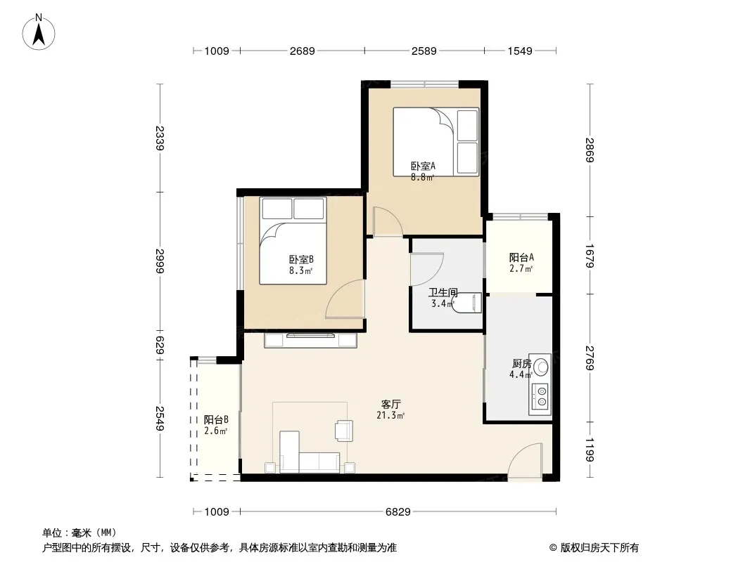 户型齐全,主打客厅朝南二居