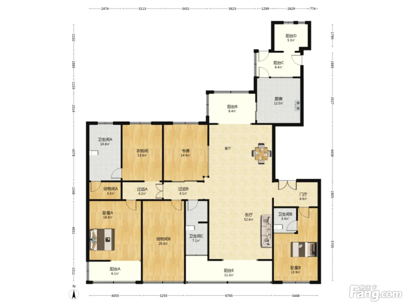 品质五房户型方正,南北通透,带前后四阳台餐客厅一体舒适。