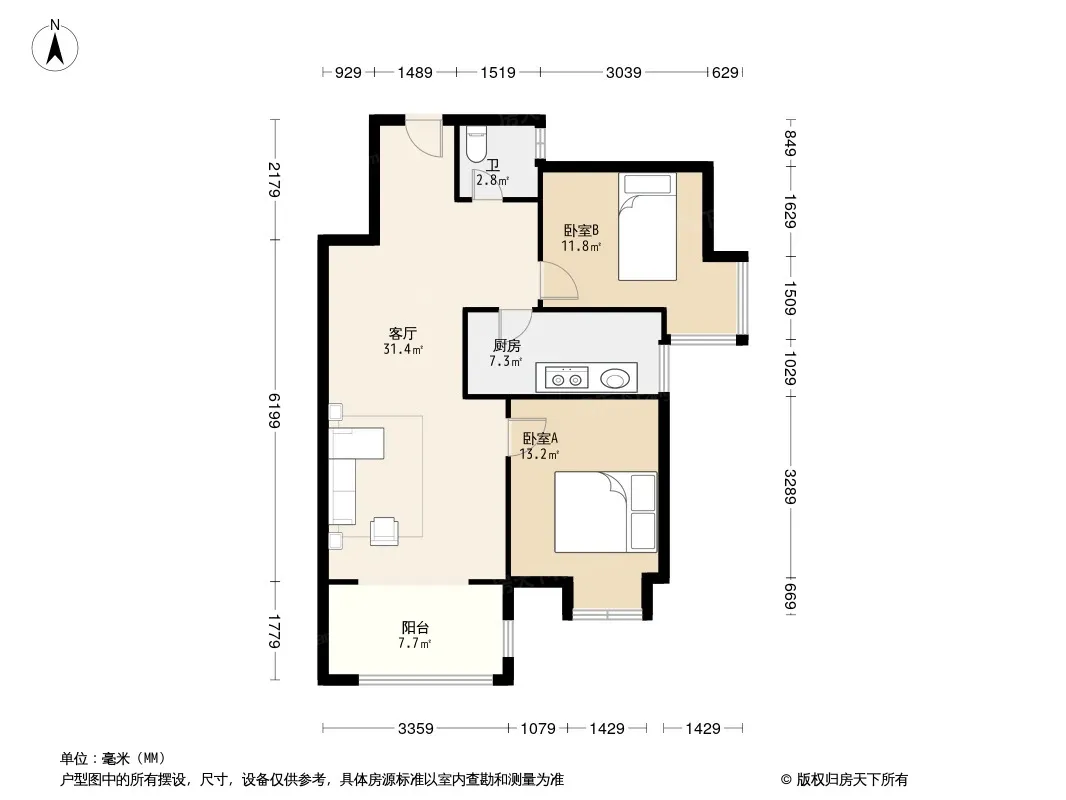 户型齐全,主打明卫,客厅朝南,主卧朝南二居
