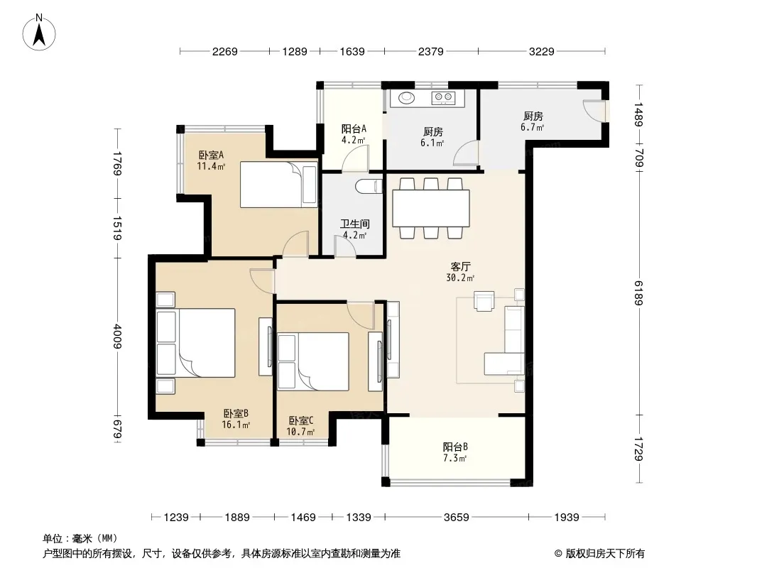 户型齐全,主打明厨,客厅朝南,双阳台,双卧朝南,主卧朝南三居