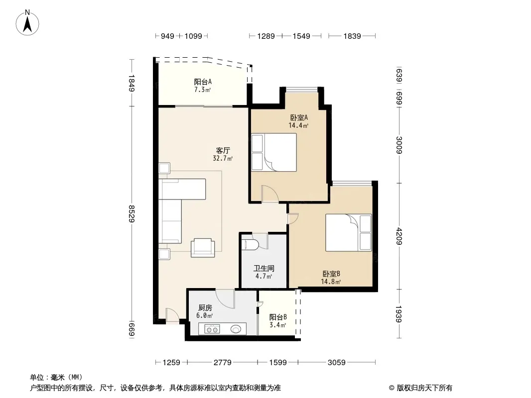 户型齐全,主打户型方正,明卫,明厨,客厅朝南,全明格局二居