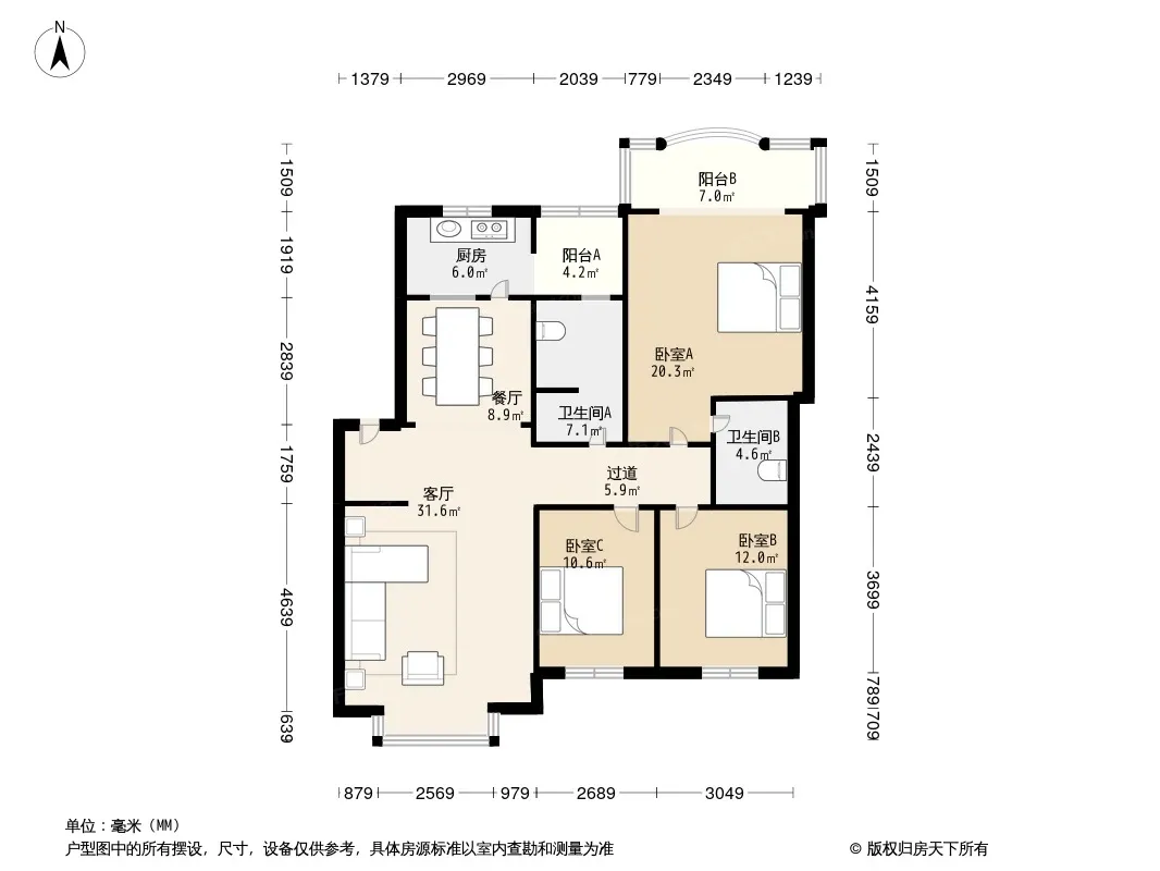 户型齐全,主打客厅朝南,双阳台三居