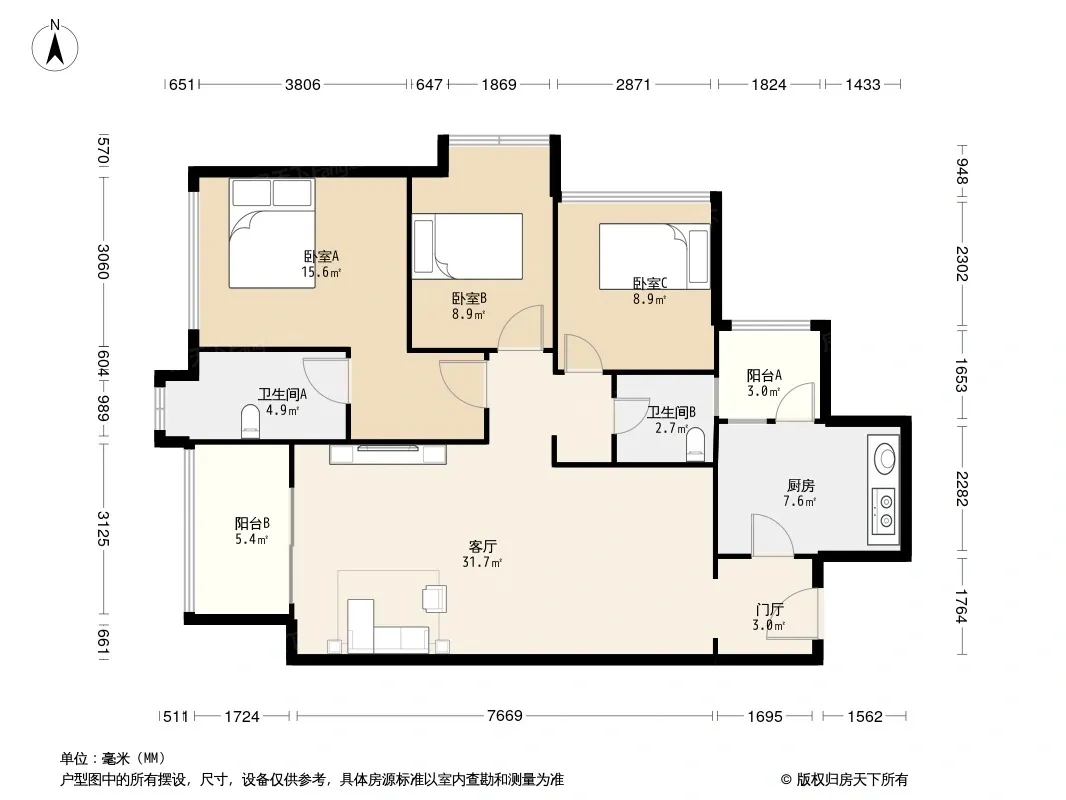 户型齐全,主打明厨,明卫,客厅朝南,全明格局三居