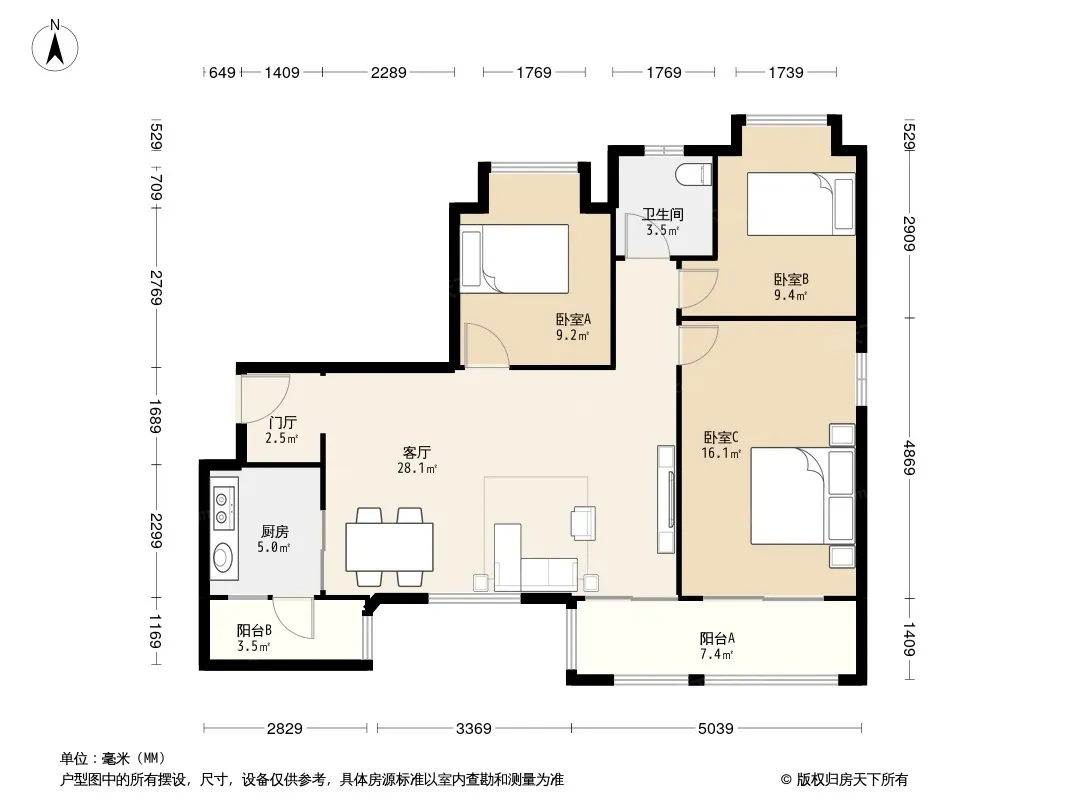 户型齐全,主打明卫,客厅朝南,双阳台三居