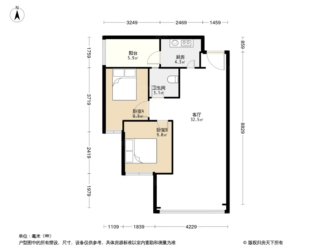 户型齐全,主打明厨,客厅朝南二居