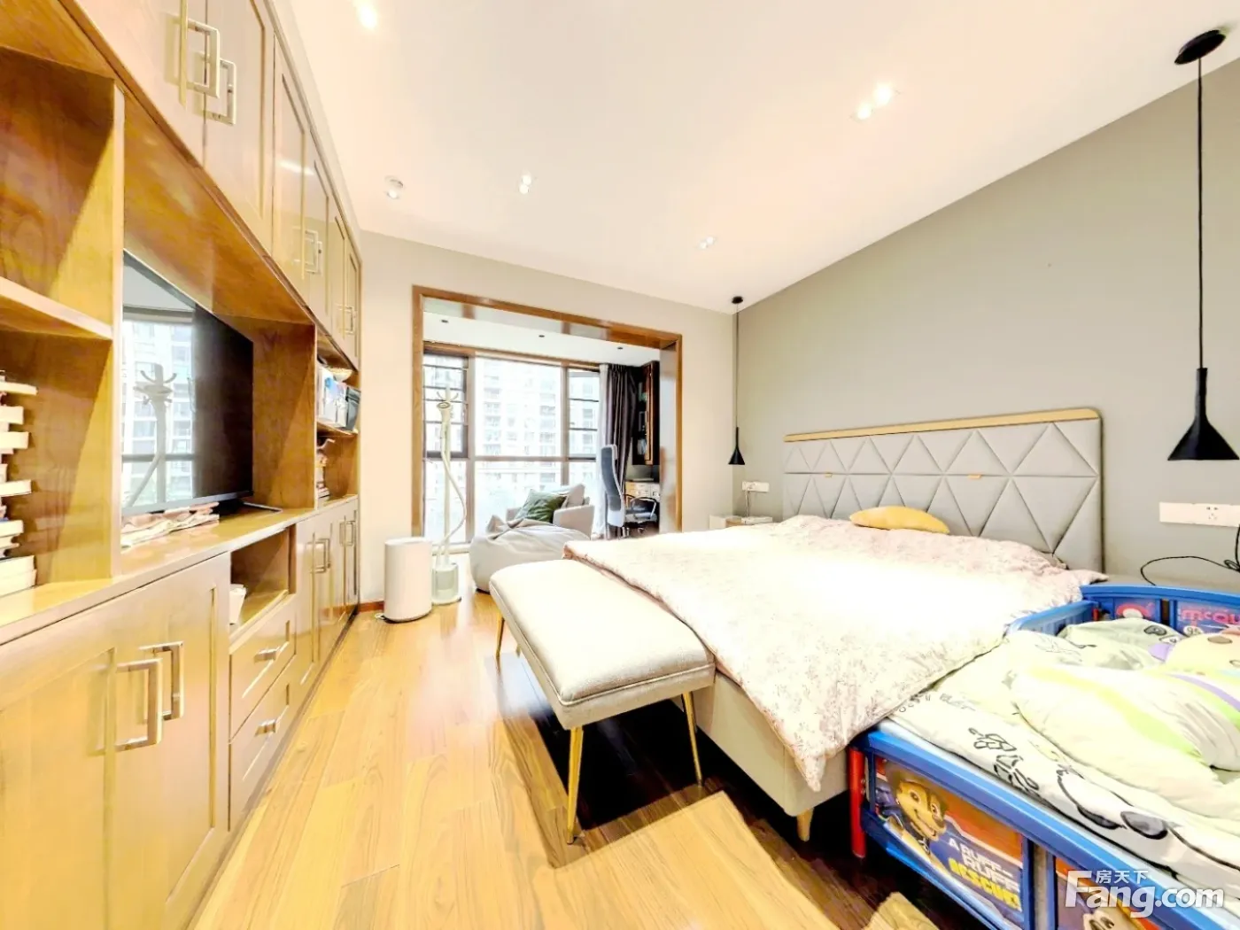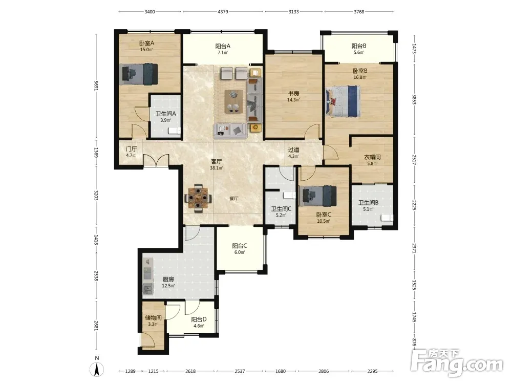 此房南北向,通透户型方正,标准四房三卫(双套房)板式设计,主卧带书房,四阳台采光采景;