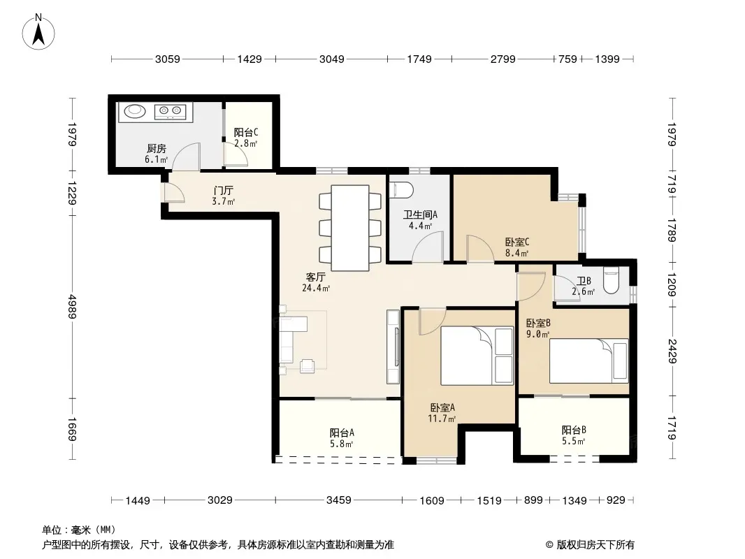 户型齐全,主打明厨,明卫,客厅朝南,全明格局三居