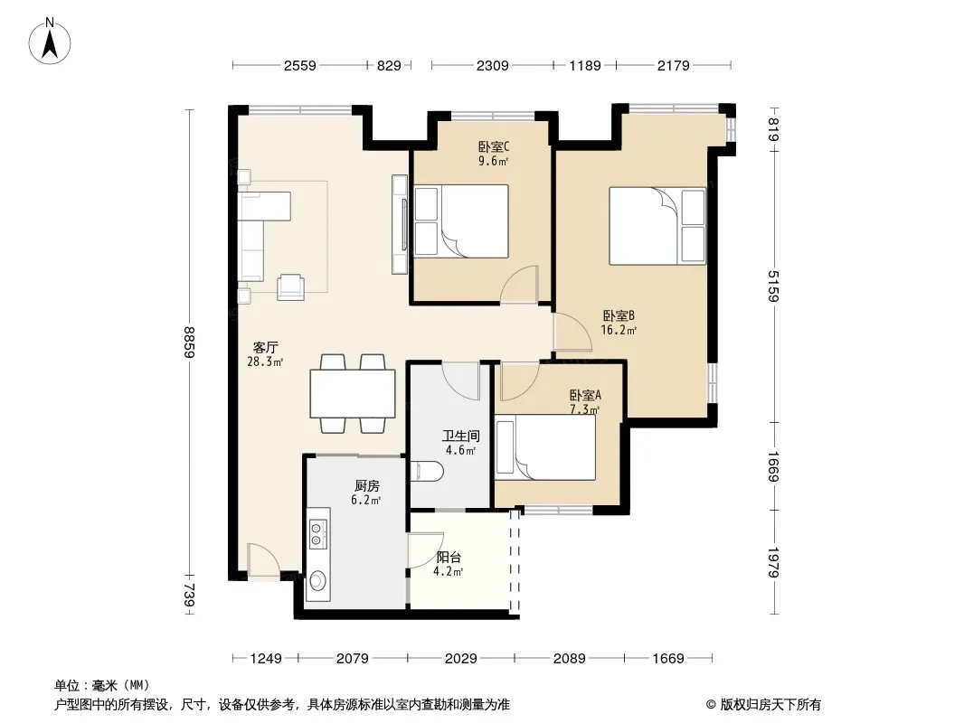 户型齐全,主打客厅朝南,双卧朝南,主卧朝南三居