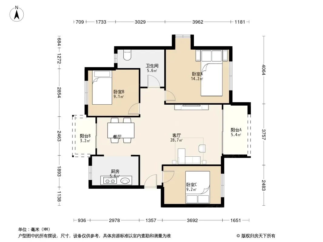 户型齐全,主打户型方正,明厨,明卫,客厅朝南,双卧朝南三居