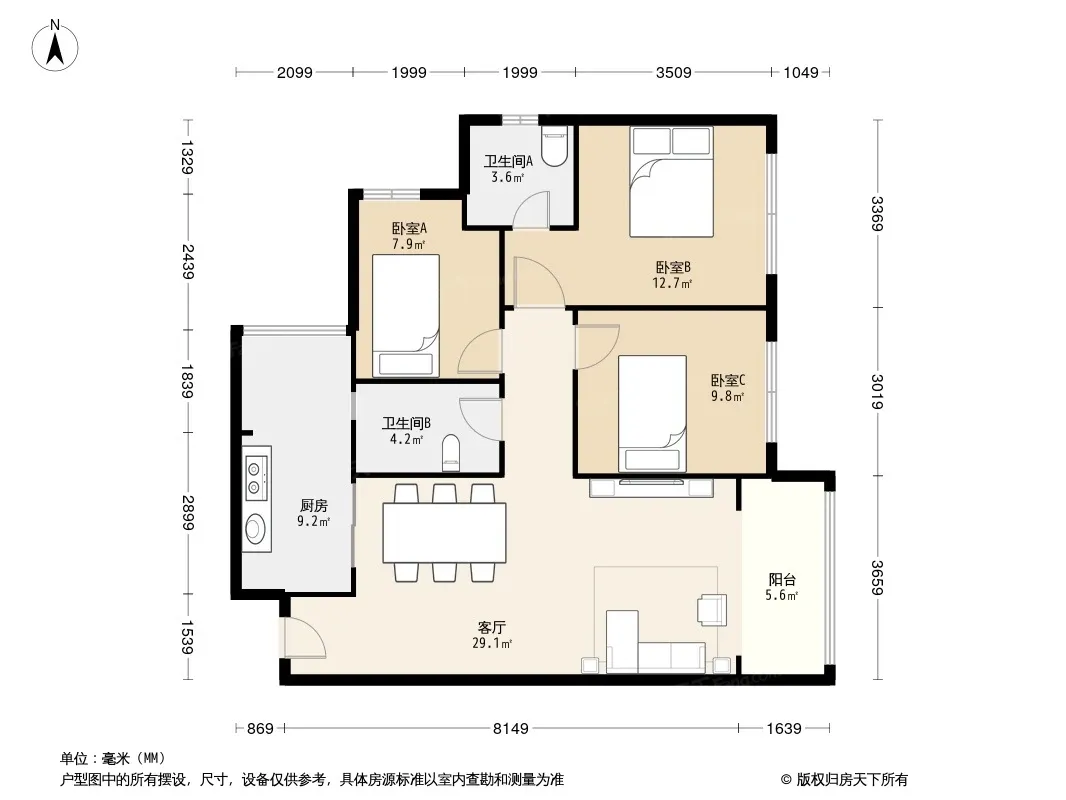 户型齐全,主打明卫,客厅朝南,双卧朝南三居
