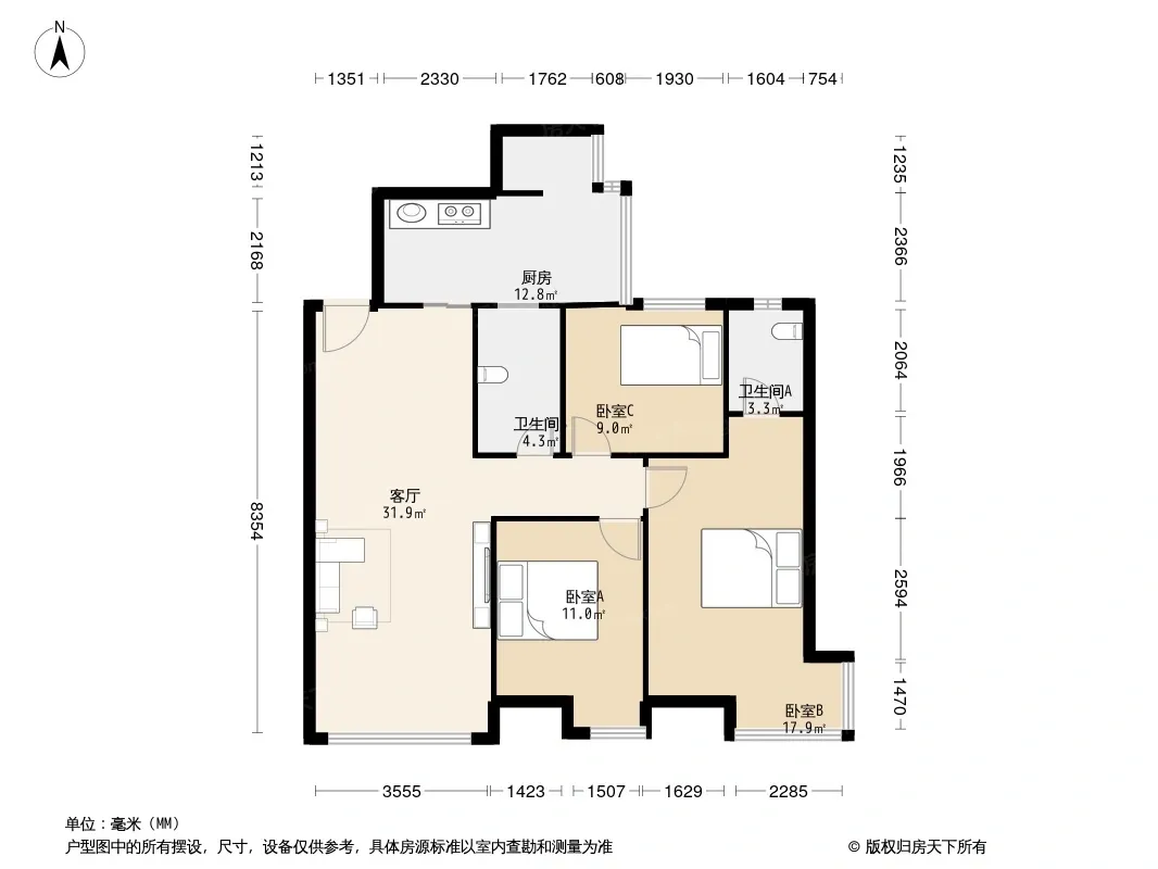 户型齐全,主打明厨,明卫,客厅朝南,全明格局,双卧朝南,主卧朝南三居