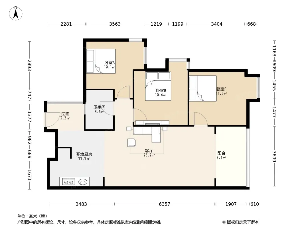 户型齐全,主打独立衣帽间,明卫,明厨,客厅朝南,全明格局三居
