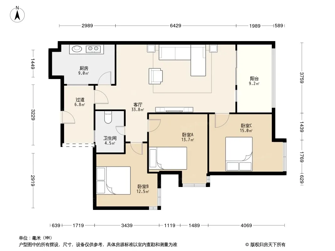 户型齐全,主打独立衣帽间,明卫,明厨,客厅朝南,全明格局三居