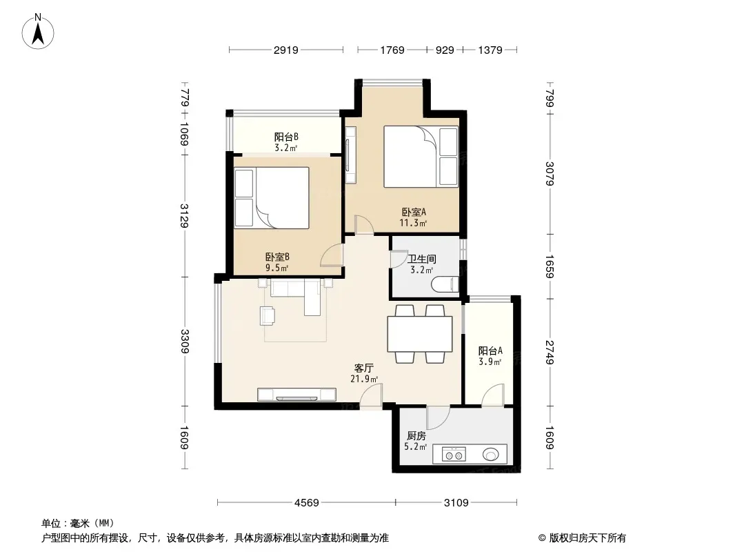 金牛万达C组团 2室2厅 东南