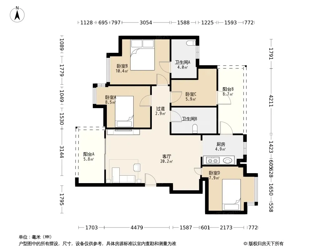 户型齐全,主打明厨,客厅朝南,双卧朝南三居