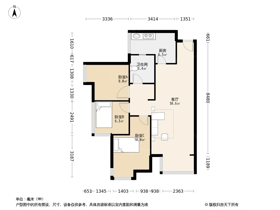 户型齐全,主打明厨,客厅朝南,双卧朝南三居