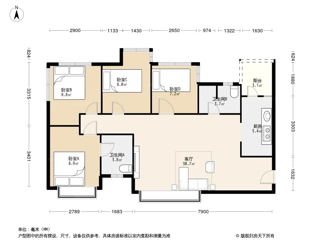 户型齐全,主打明厨,客厅朝南,双卧朝南三居