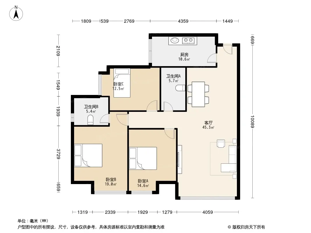 户型齐全,主打明厨,明卫,客厅朝南,全明格局三居