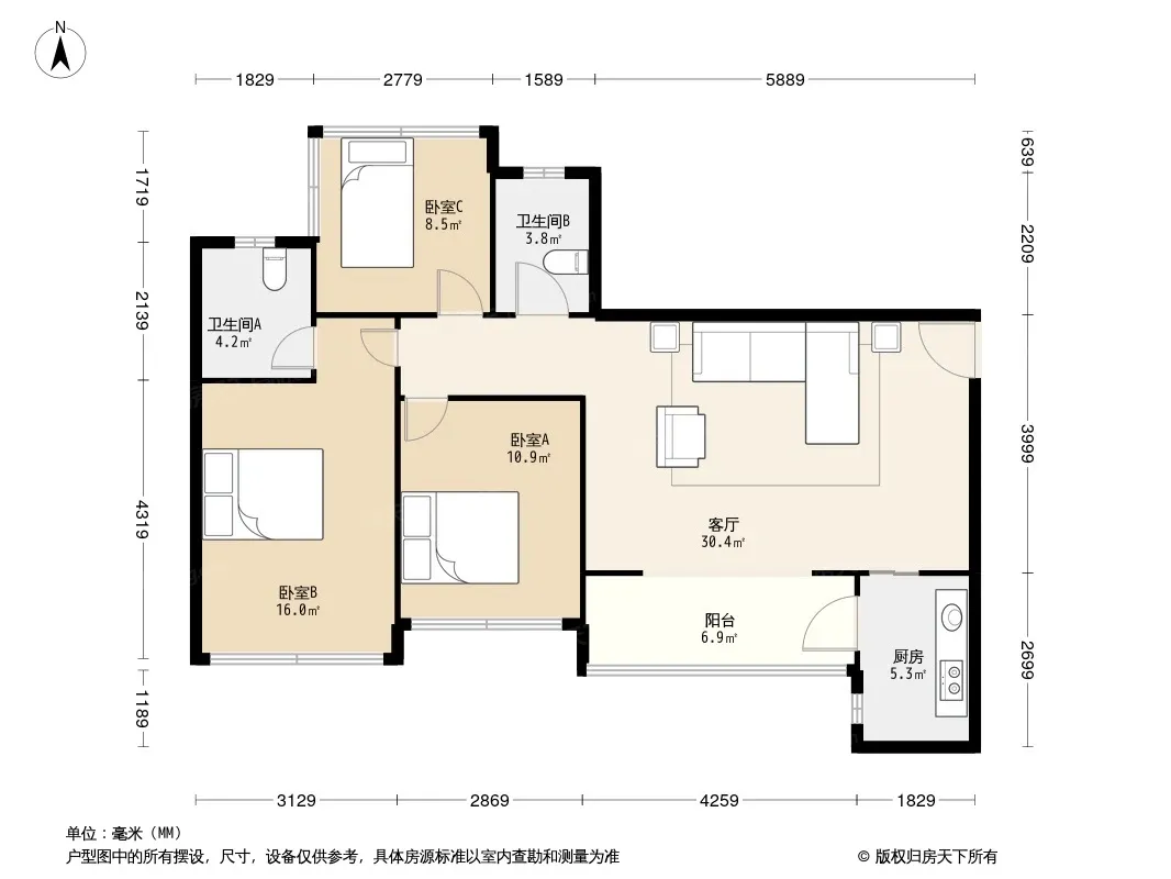 户型齐全,主打明卫,明厨,客厅朝南,全明格局三居