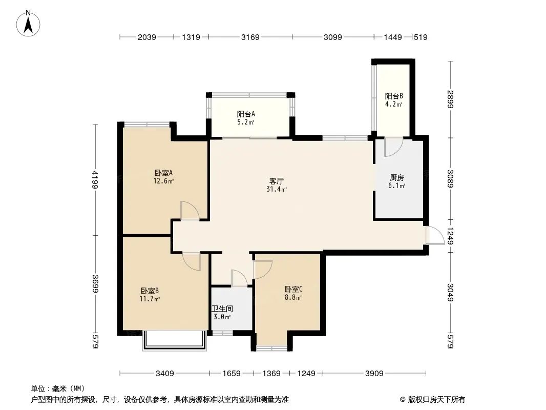 户型齐全,主打全明格局,双阳台三居
