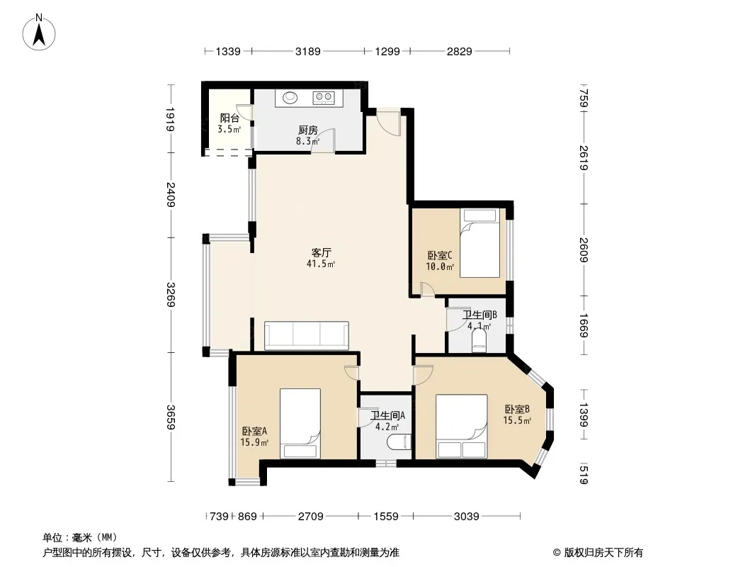 户型齐全,主打明卫,客厅朝南,双卧朝南三居