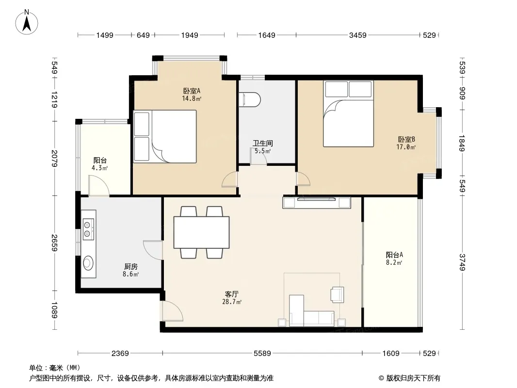 户型齐全,主打客厅朝南,双阳台,主卧朝南二居