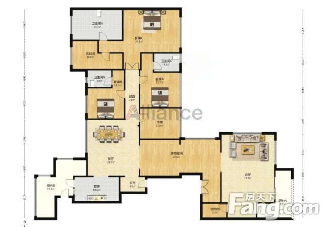 户型齐全,主打明卫,独立衣帽间,明厨,客厅朝南,全明格局,双阳台四居