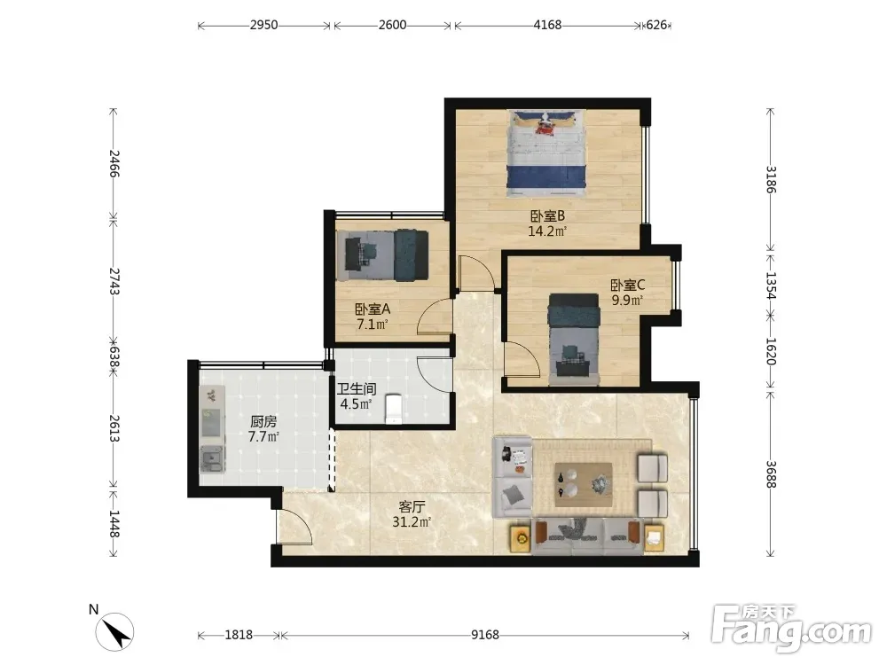 户型齐全,主打明厨,明卫,客厅朝南,全明格局三居