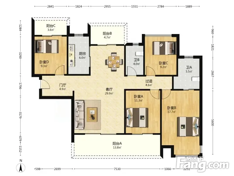 户型齐全,主打户型方正,主卧带卫,大面宽阳台四居