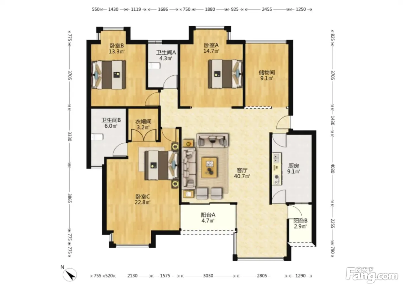 户型齐全,主打户型方正,独立衣帽间,明卫,客厅朝南三居