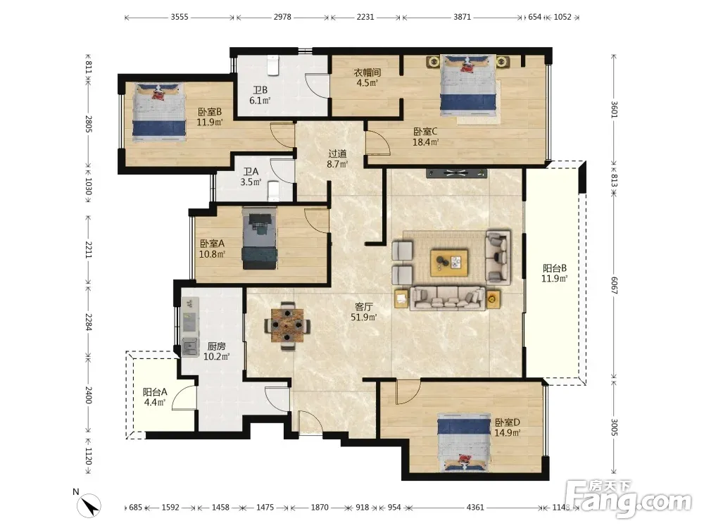 户型齐全,主打户型方正,主卧带卫,大面宽阳台四居