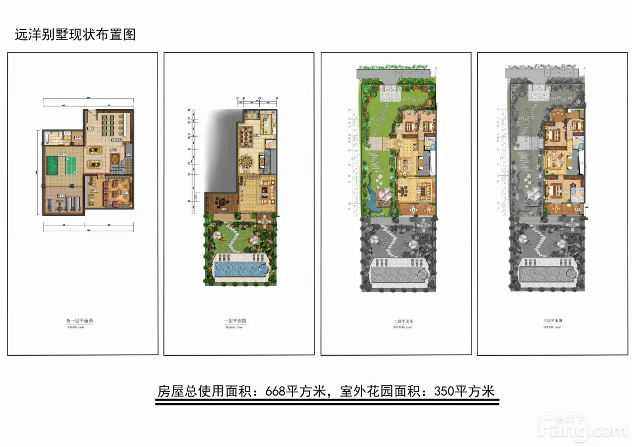 该房屋属于重庆远洋高尔夫国际社区一起联排别墅端户,共四层楼,单层使用面积135平米左右,地下室非常大,达到200平米,整栋别墅实际使用面积约650平米,别墅花园非常大,达到350平米,该别墅紧邻高尔夫球场,视野开阔。