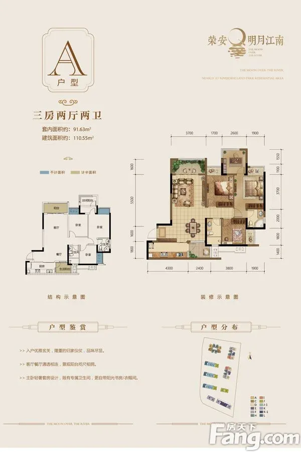 荣安明月江南户型主要有88平-110平的户型方正,动静分离,主卧带卫的三居 、114平-121平的南北通透,全明格局,户型方正,动静分离,采光充足的四居 。