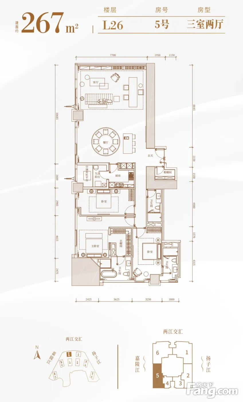 T3N朝天阁;建面1500㎡清水 一房建面130㎡,看江朝解放碑方向50楼以上 二房建面210㎡,朝中庭 三房建面243-380㎡,侧看嘉陵江 四房建面440-470㎡,正看两江交汇 五房建面730-770㎡,正看两江交汇,62楼以上,共8套