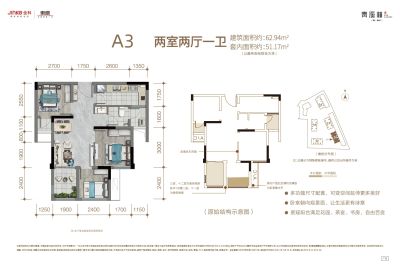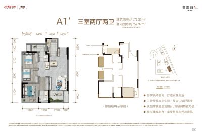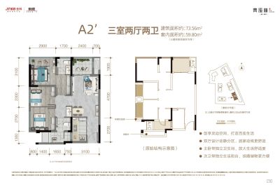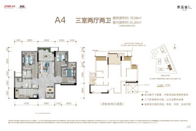 建筑面积:62㎡-77㎡,三房一卫、三房两卫 总层高:13层,接房时间:现房