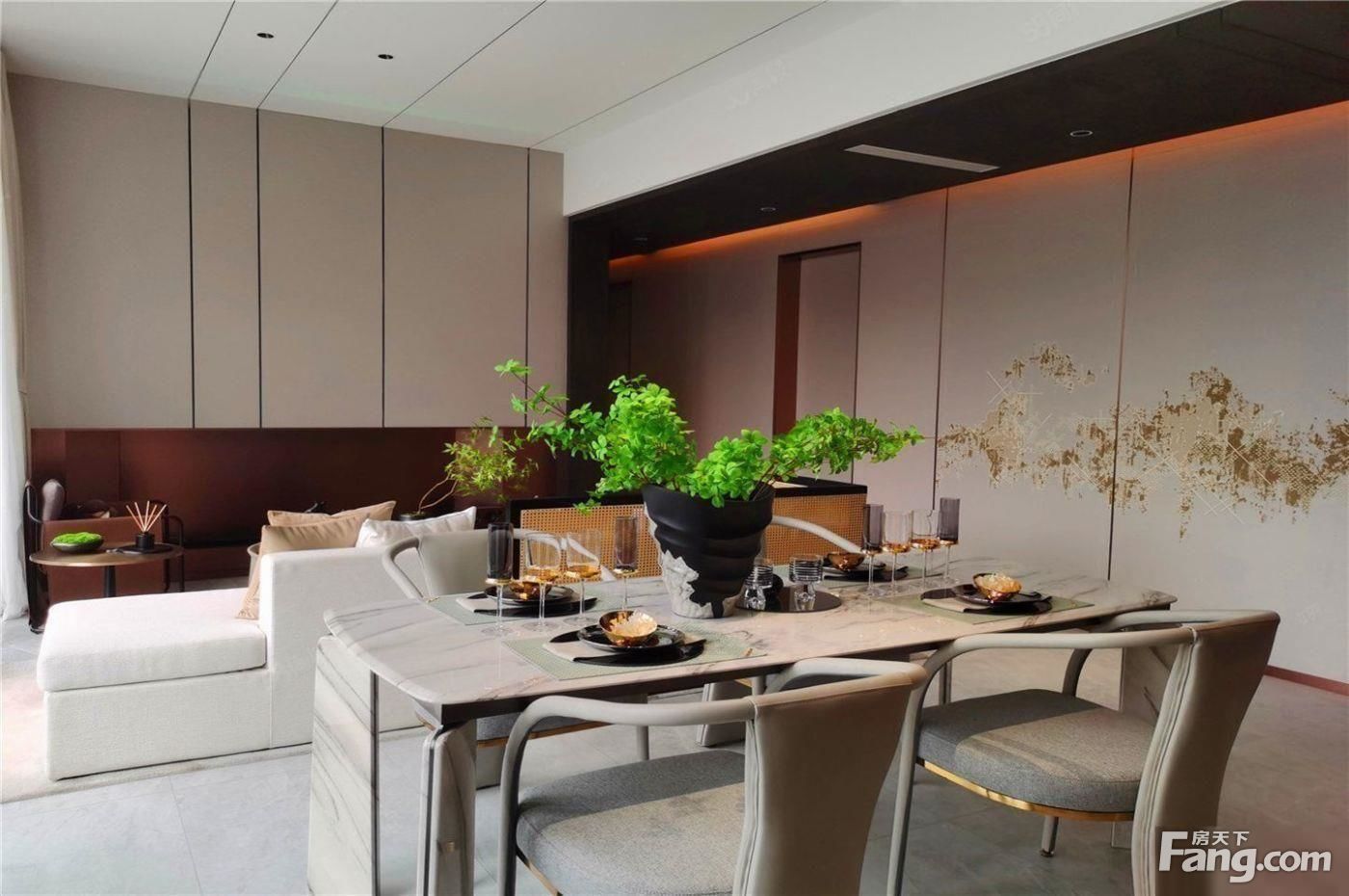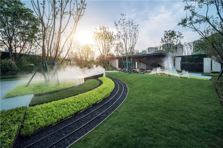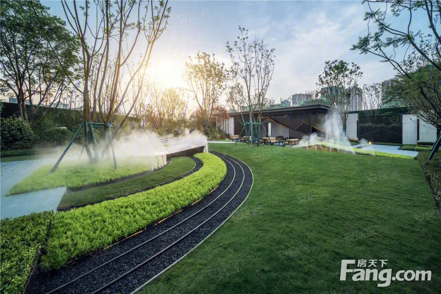 整个小区才用的是新中式风格,外立面是由米白色加咖啡色的真石漆打造,立面简洁大气,结合景墙一体化打造,'强化两建筑之间的礼序感,与入口形成轴线关系;小区景观以彩凤·凤飞起舞的理念打造;一轴三园, 礼遇入口(入口景墙高低错落,迂回秩序,整体干净大气 . 以"庭有嘉木,有凤来仪"为主题,入口内庭结合 特色植物(如栾树)打造林下空间) 萌趣花园(围绕乐兔与它的小鸟朋友打造一个森林里的自然乐 园.引导儿童自然亲密,在亲子共同的探索中,感受大 自然的规律) 轻氧花园(休闲平台结合消防扑救面,打造轻氧交流空间 .以铺装变化来打破登高面的呆板形式.考虑人车混行,设置移动花箱隔断人群活动空间与 车行空间)