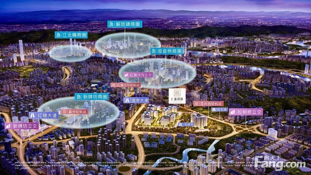 商业配套: 项目位于重庆几大核心商圈的交汇处,1-2公里多个商圈环绕: 新牌坊商圈、观音桥商圈、大石坝商圈,距离SM广场仅约1.2公里,东原新新PARK购物中心约1.5公里。 交通配套: 三轨交汇(3/6/4号线建设中门口) 6号线步行1000米到6号线花卉园站。 3号线步行1200米左右到3号线嘉州站。 4号线2025年建成通车4号线西延伸站龙溪站。