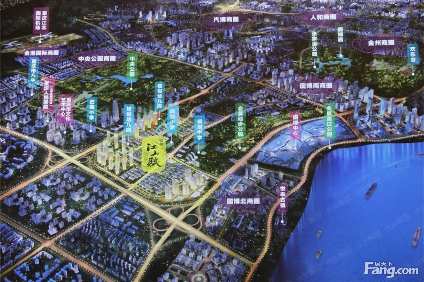 基本信息: 悦来在售百万方项目!整个项目占地850亩,总建筑面积150万方,分5期打造,产品包含高层、大平层、洋房、别墅、商业,目前在售3期。 ?重庆国际博览中心:是世界前十、中国第二、西部的会展中心,是重庆面向的名片,也是面向世界的一个窗口。国博中心总建筑面积60万方,室内展览面积20万方。共设16个展厅,南北各8个。带动区域经济。 重庆仙桃数据谷:总占地面积约1346亩,是继美国硅谷、北京中关村以后中国的IT云计算中心,主要布局大数据、云计算和跨境电子商务等新兴产业,将吸引大批国际科技人才,未来常驻员工超10万人。(距离1.5公里) 中央公园:世界第三大、开放式城市公园,占地面积2300亩,总投资46亿元,为首地江山赋提供源源不断地负氧离子。(距离3公里)