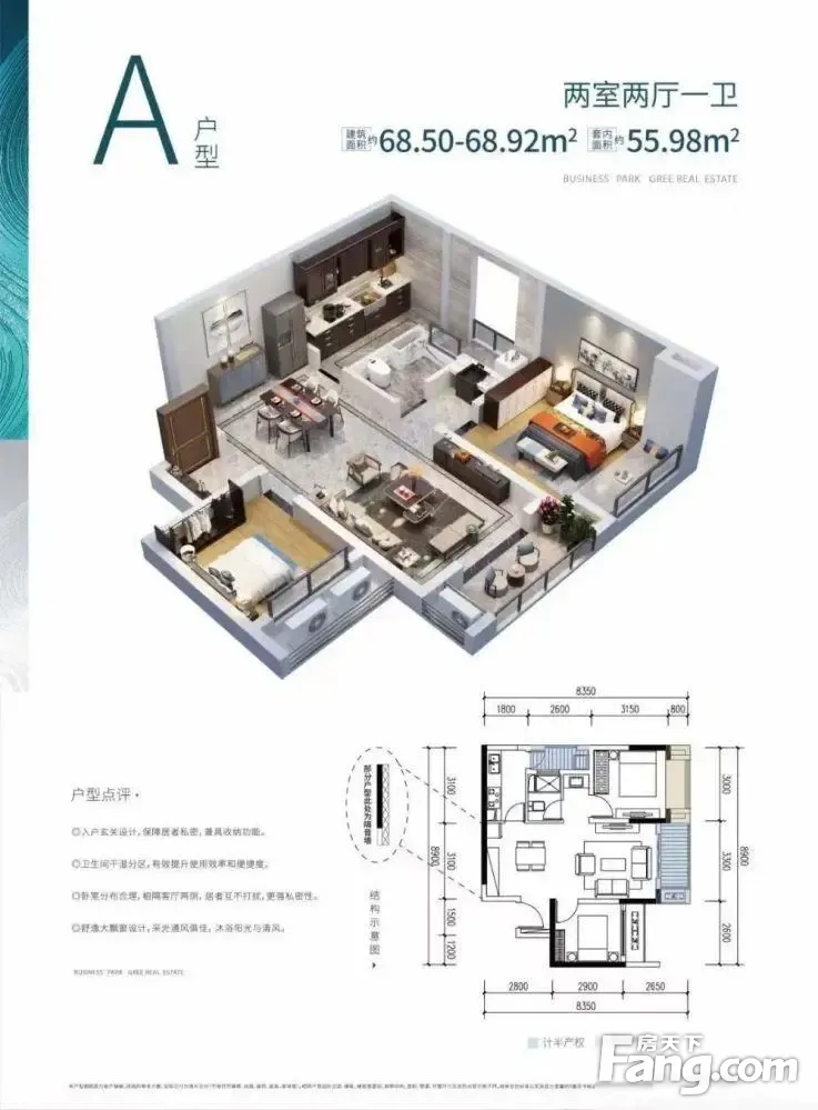 格力两江总部公园3期户型主要有78平-95平的全明格局,户型方正的三居 、57平-68平的户型方正,动静分离,采光充足的二居 。